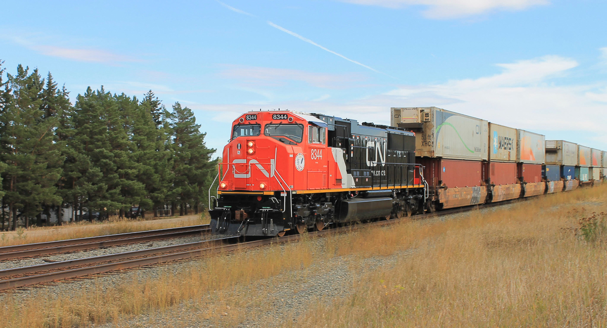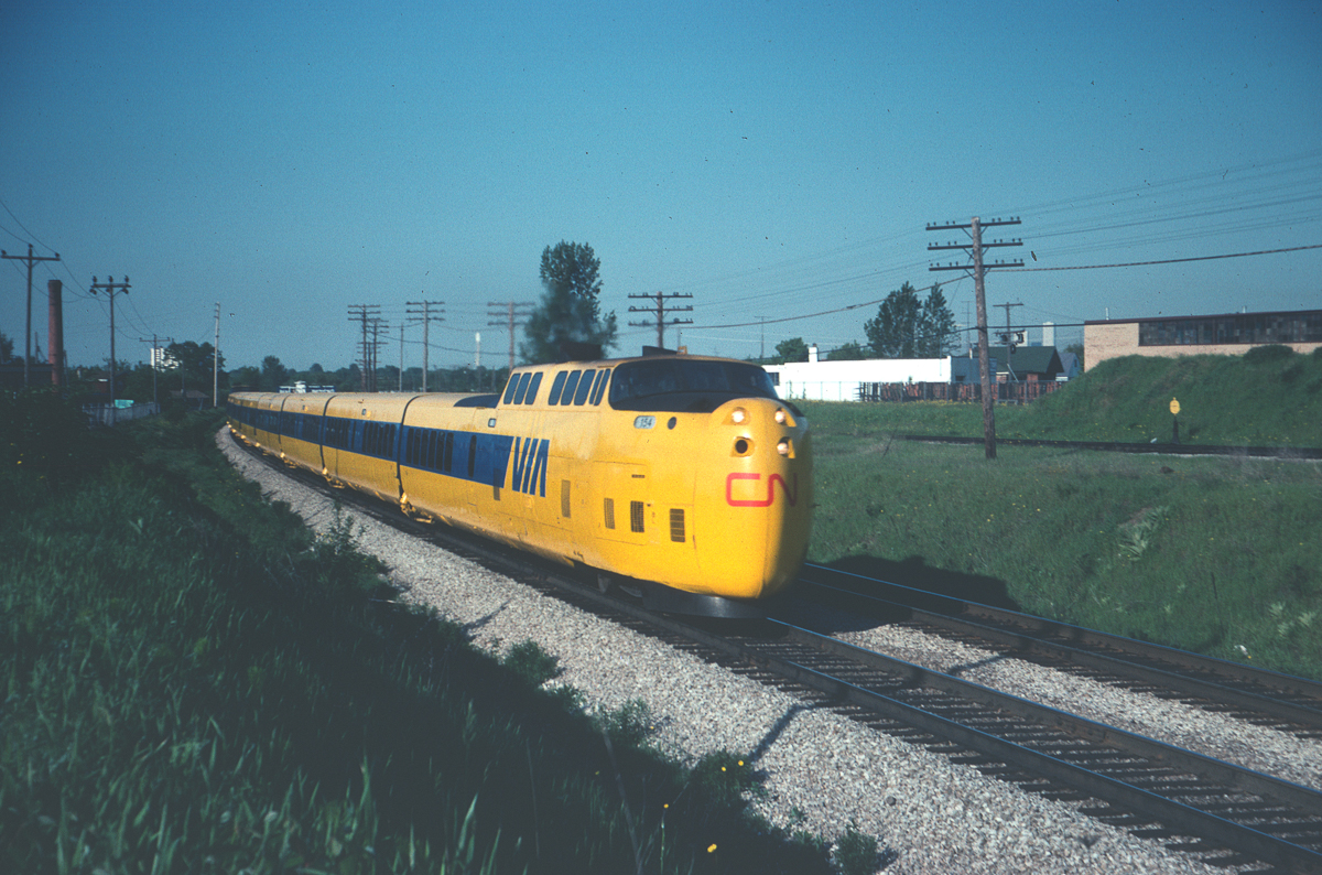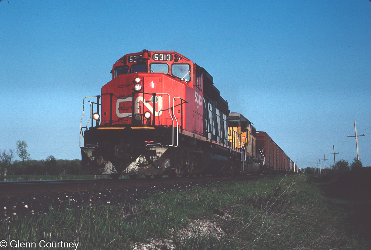CN SD40-2W No. 5313 leads an eastbound freight on the Halton Subdivision in Milton, Ontario near the location that CN calls Ash on May 21, 1994. Ash is the eastern end of a section of double track between Tanslay and Ash.