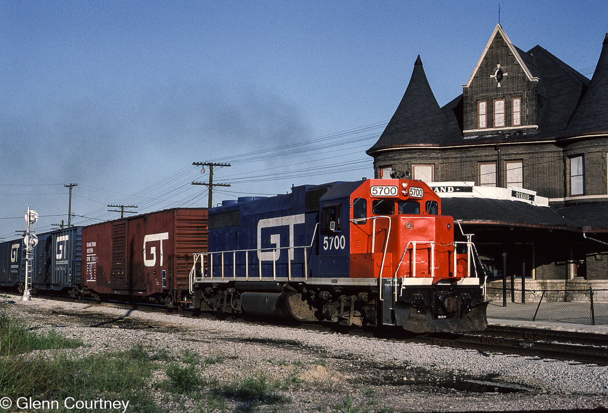 Grand Trunk Western GP38-2 No. 5700, operating solo, leads train #253 past the station in Durand MI on August 20 1988.