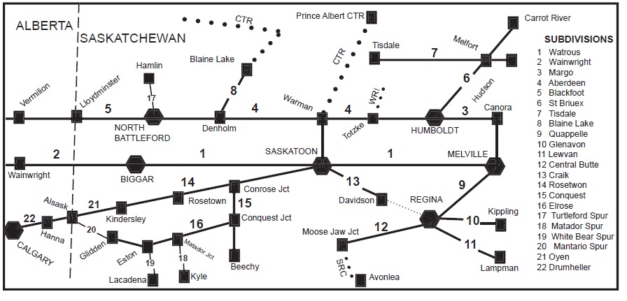 | Aberdeen | Humboldt, Saskatchewan | North Battleford, Saskatchewan | 147.7 miles | OCS and CTC | Aberdeen |