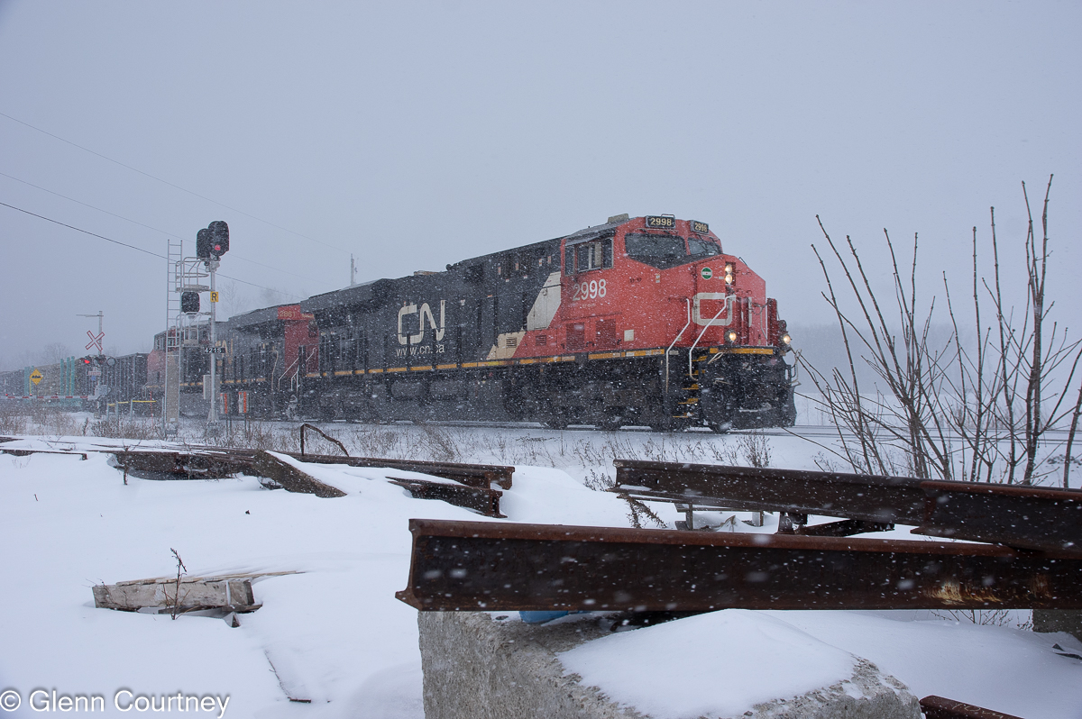 CN GE ES44AC 2998 leads an eastbound train at Mile 42.1 of Halton Subdivision East Mile 42.1. This location is on the southern edge of Milton, Ontario and is known as Tansley on CN. The signals at Mile 42.1 are part of the track changes CN has made to accomodate the intermodal yard being constructed about a mile north of here (timetable east). (Photo by Glenn Courtney)